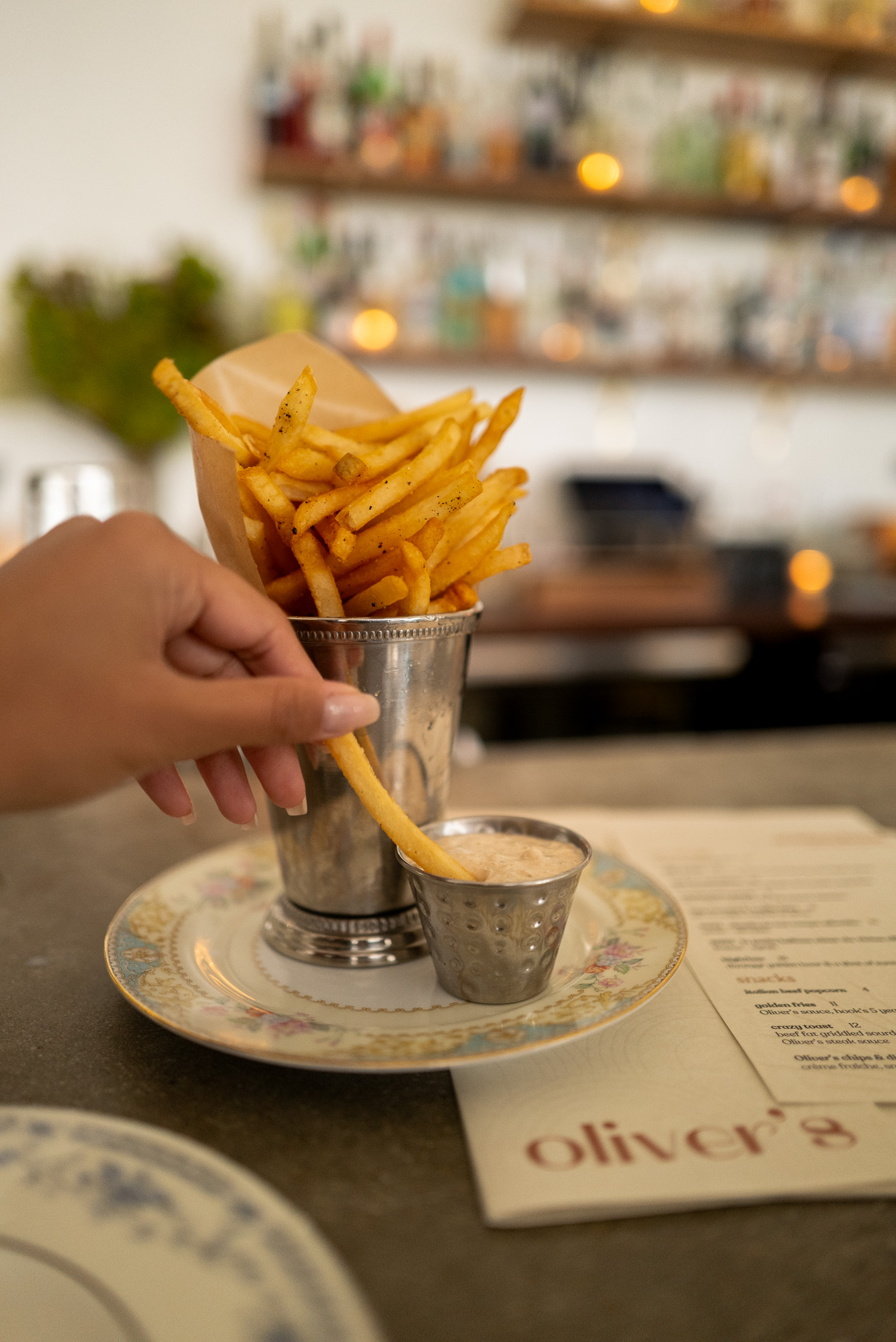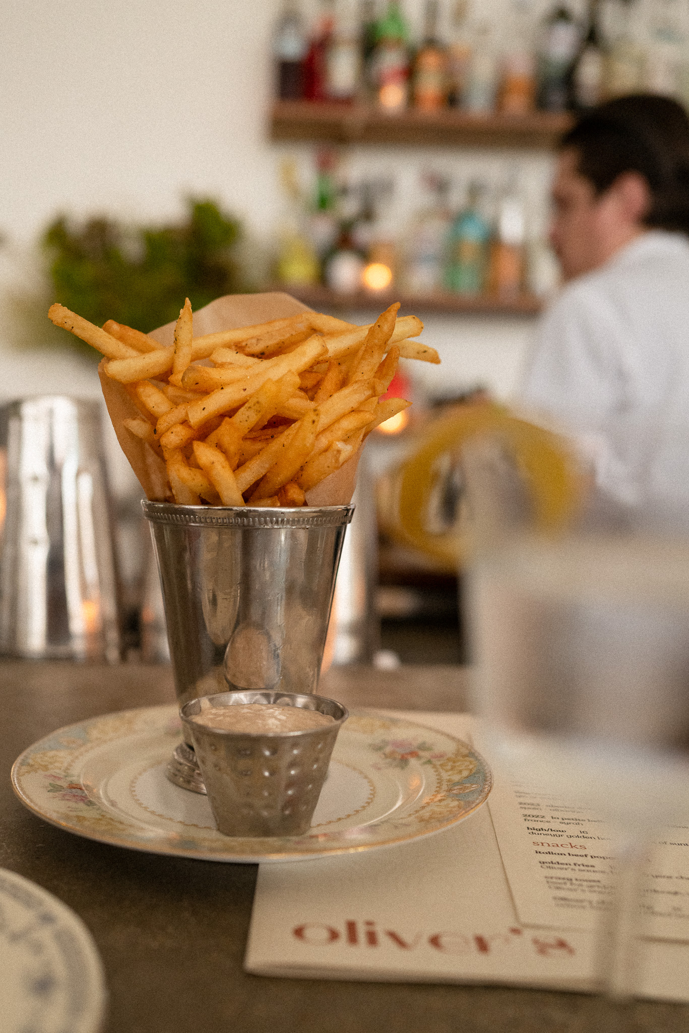Oliver’s pays tribute to the 1930s, blending velvet seating with vintage artwork. It’s a mix of soft natural lighting thats easy on the eyes and compliments skin tones in photos. It’s warm, inviting, bustling, and cinematic.